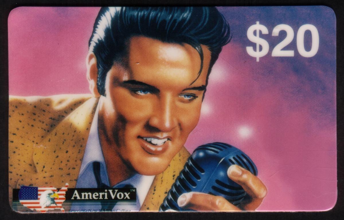 Elvis Presley themed phone card featuring a vibrant, detailed illustration of Elvis in a lively pose with colorful background, value, and branding details. |