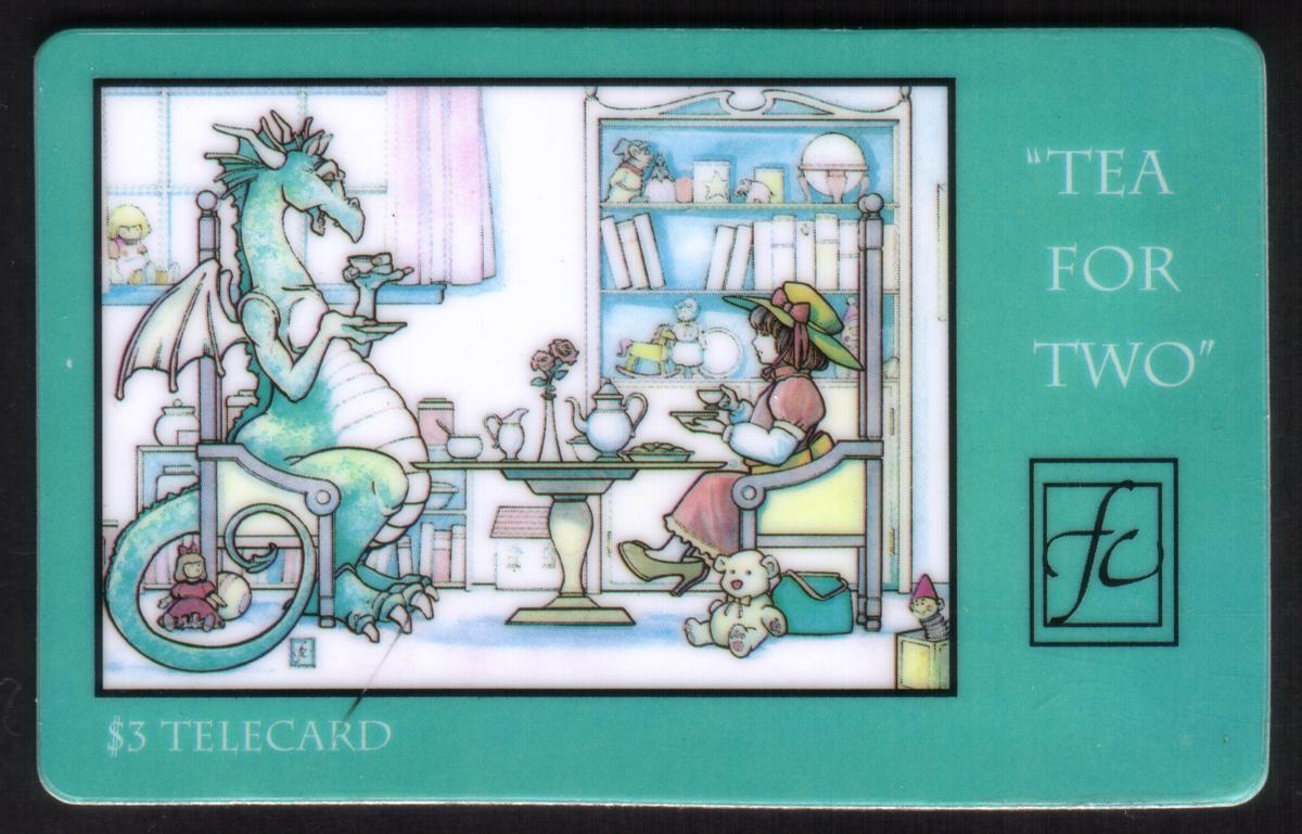 The third telecard, "TEA FOR TWO," captures a dragon and a girl having an indoor tea party. The dragon, pale blue with curled horns, sits elegantly on a chair holding a teacup. Opposite the dragon, the girl wears a bonnet and dress while seated at a small table with tea sets and toys scattered around. The pastel colors and detailed background provide a cozy, intimate setting. This card has a turquoise background with the "fc" logo in black.