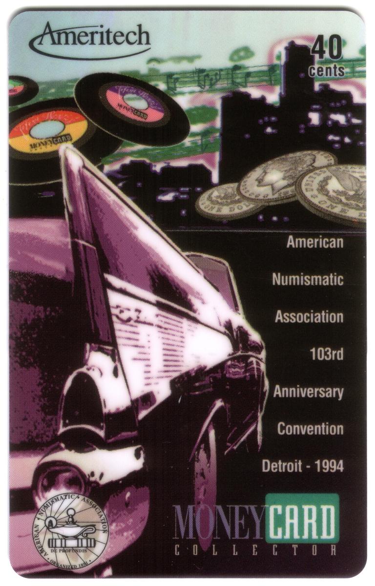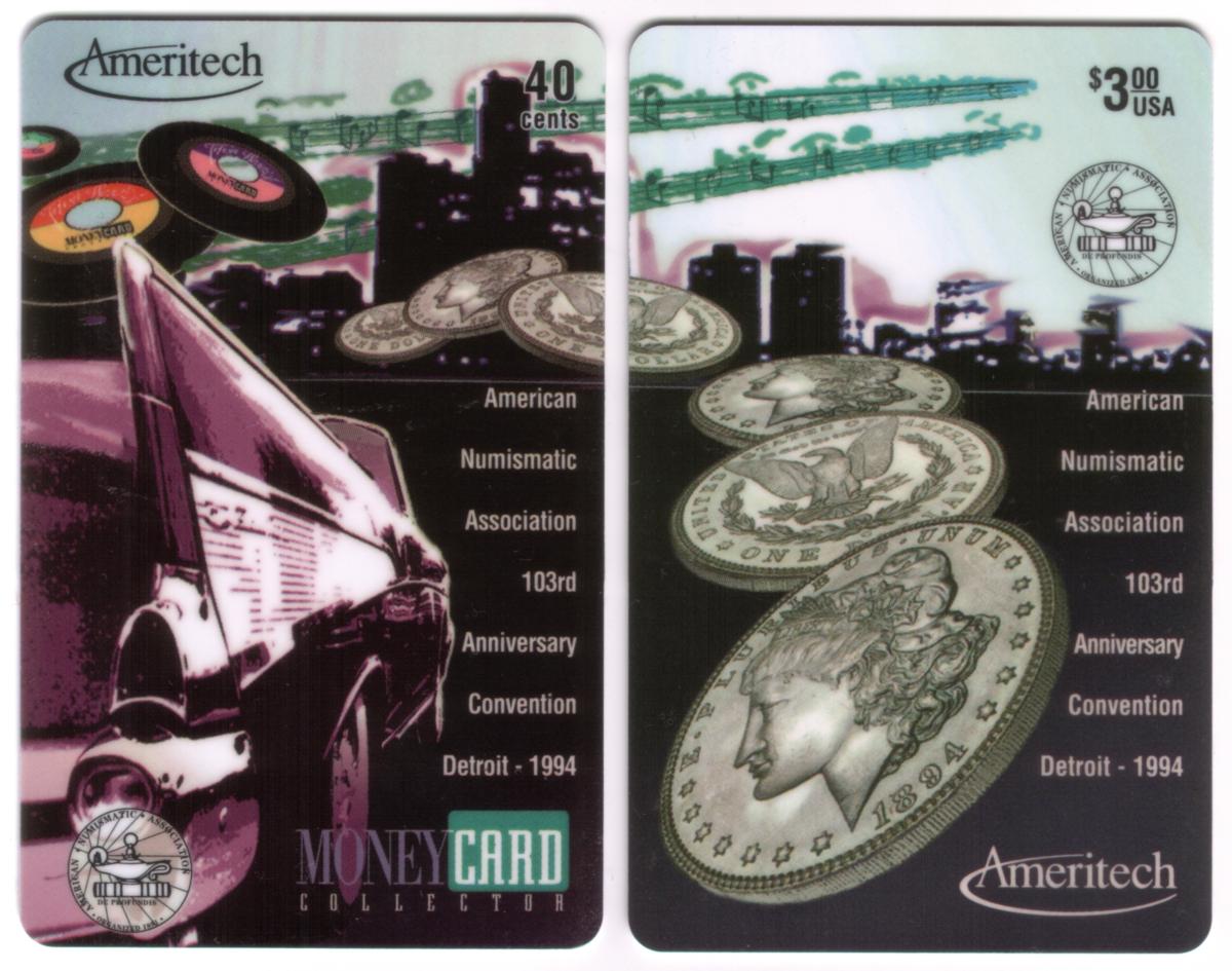 Collectible phone cards from the 1994 ANA Detroit convention featuring coins, Detroit skyline, vintage cars, music elements, and telecommunication details. |
