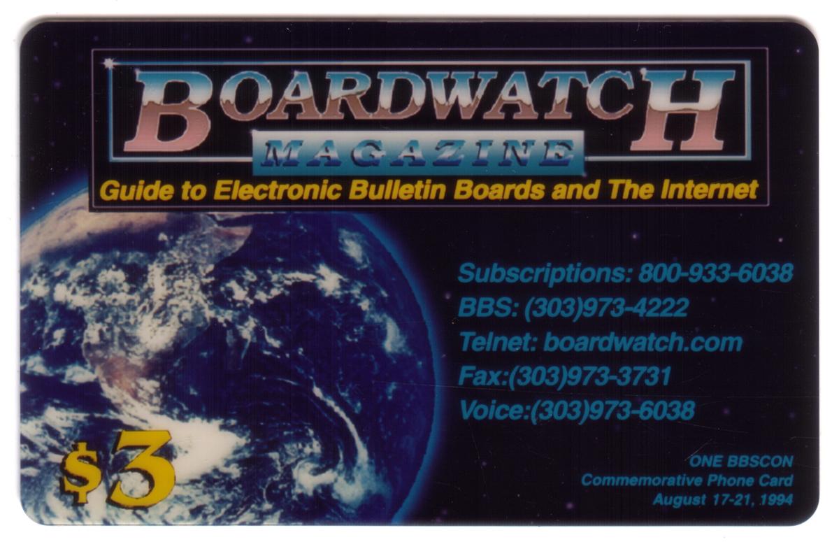 The card also references "bbs," "bbscom," and "Boardwatch Magazine," specifically the "$3 Boardwatch Mag Electronic Bulletin Boards & Internet Guide USED," providing a clear connection to early electronic bulletin boards and internet resources. The term "WorldCom" appears prominently, indicating an association with this telecommunications company.