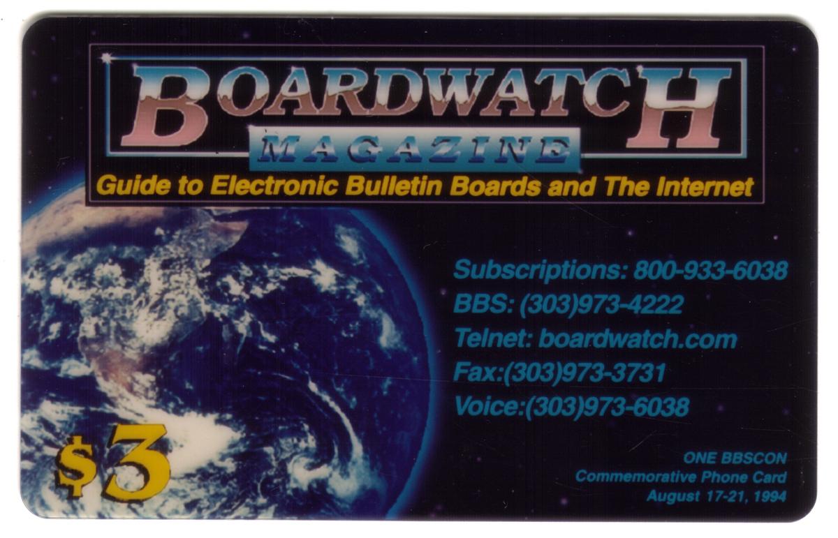 The card blends a technological theme with space imagery, emphasizing its ties to the computer industry, information technology, and electronic bulletin board systems (BBS). The brand "Boardwatch Magazine" and the reference to BBSCON, a conference focused on BBS and internet topics, mark this card as a collectible item tied to early 1990s IT culture and communications.