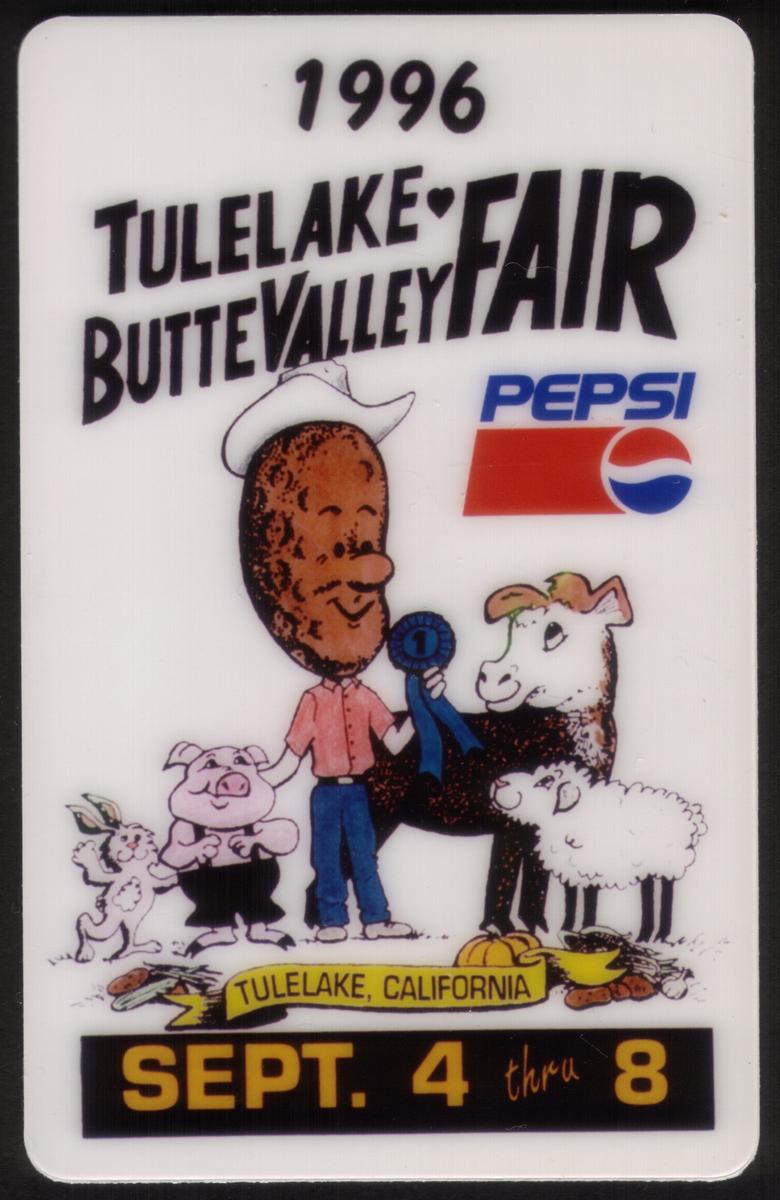 This collectible card features the design commemorating the 1996 Tulelake-Butte Valley Fair held in Tulelake, California. The card prominently displays the event name "1996 Tulelake Butte Valley Fair" in bold, stylized black text at the top. To the right of the text is the Pepsi logo, consisting of the word "PEPSI" in blue next to a red, white, and blue circular emblem.