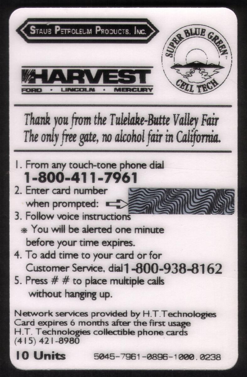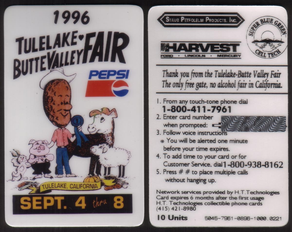 1996 Tulelake-Butte Valley Fair phone card featuring cartoon farm animals, fair branding, Pepsi logo, usage instructions, and community celebration details. |
