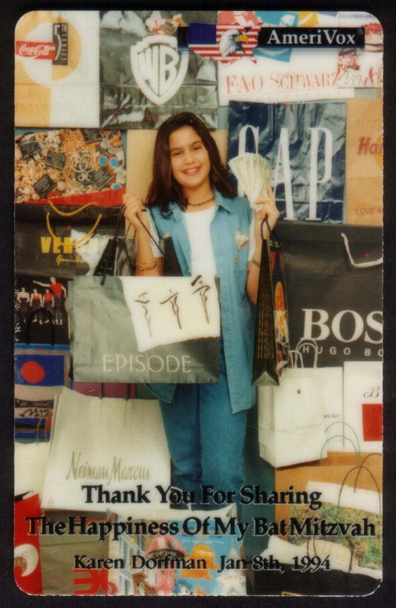 1994 Bat Mitzvah phone card featuring Karen Dorfman with shopping bags, brand logos, and celebratory imagery reflecting culture, commerce, and tradition. |