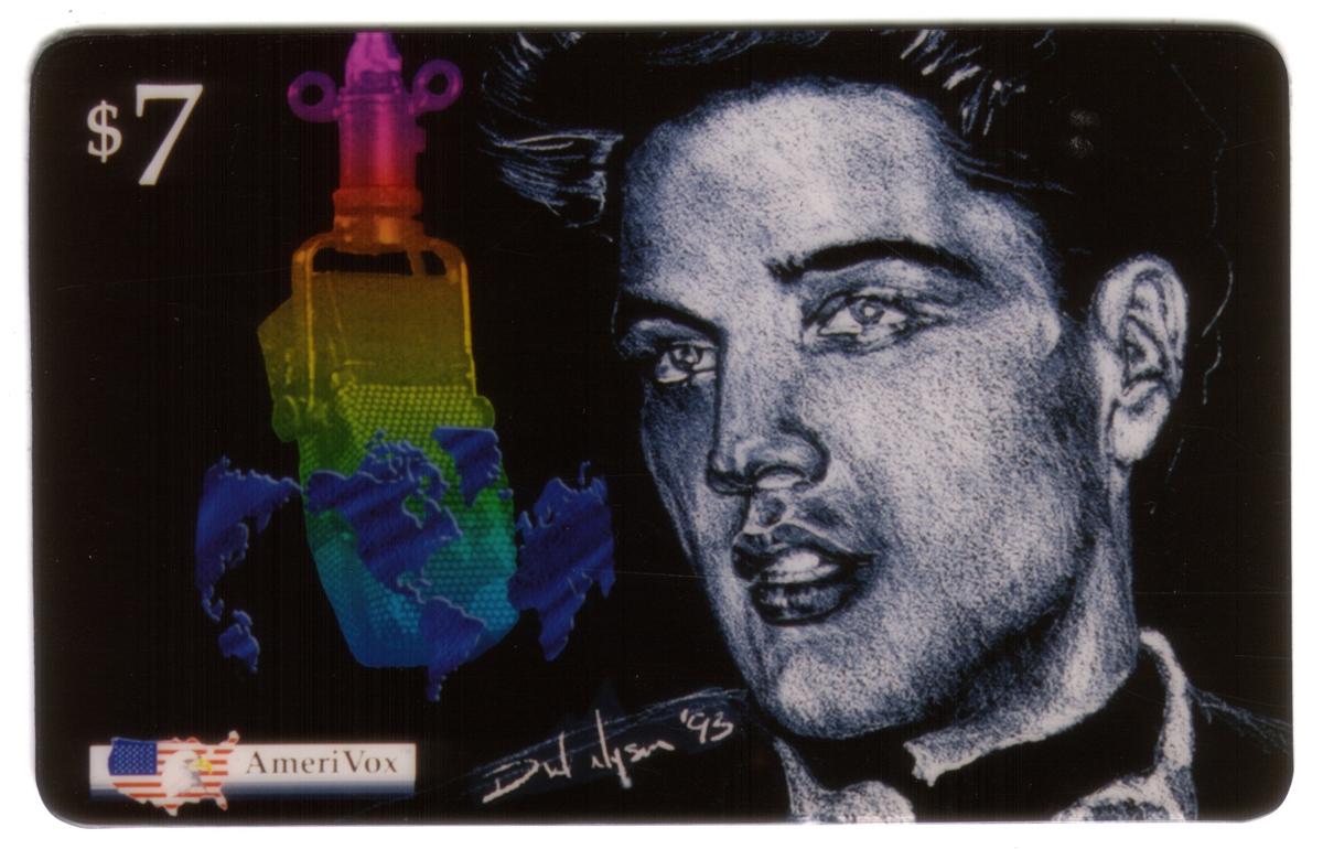 Elvis Presley portrait with monochrome shading, vibrant holographic microphone, $7 value, AmeriVox logo, signature, and Americana motifs, blending art and utility.