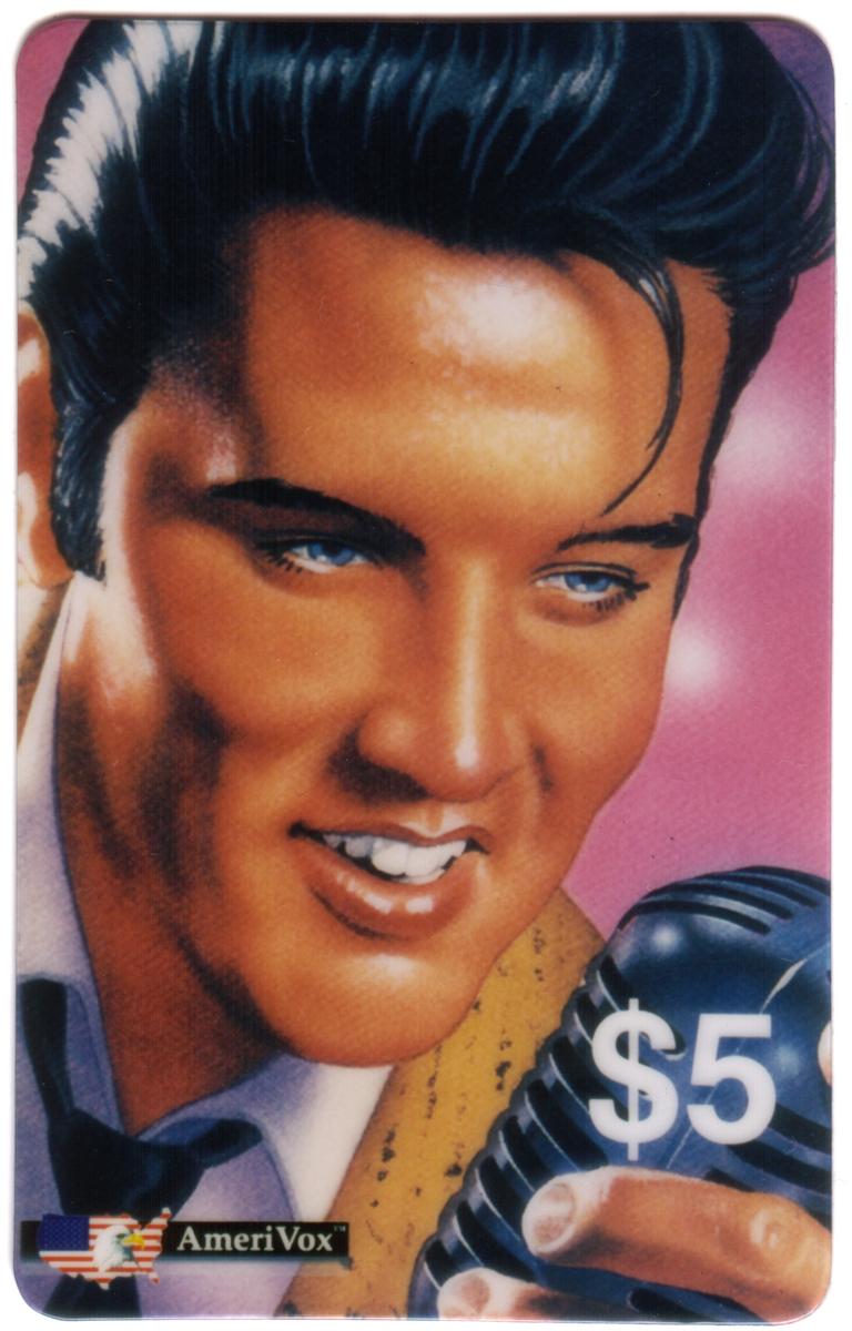 Vivid Elvis Presley portrait on a prepaid phone card featuring his iconic look, vintage microphone, $5 value, and patriotic AmeriVox branding.