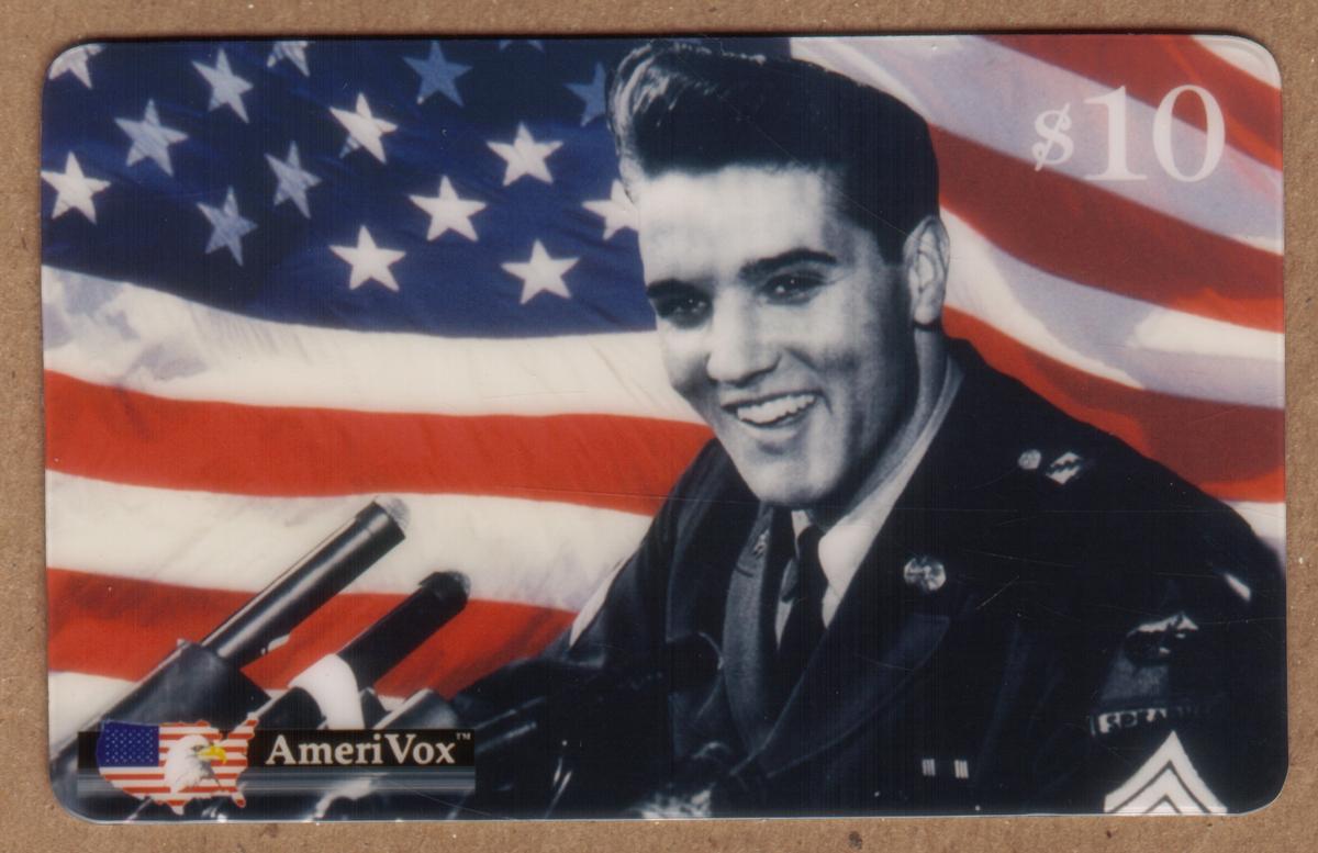 In the lower left corner of the card, there is an AmeriVox logo accompanied by a small American flag graphic with a bald eagle silhouette, indicating the card’s production or branding. The overall tone and design emphasize Elvis Presley’s status as an American icon and his service in the military.