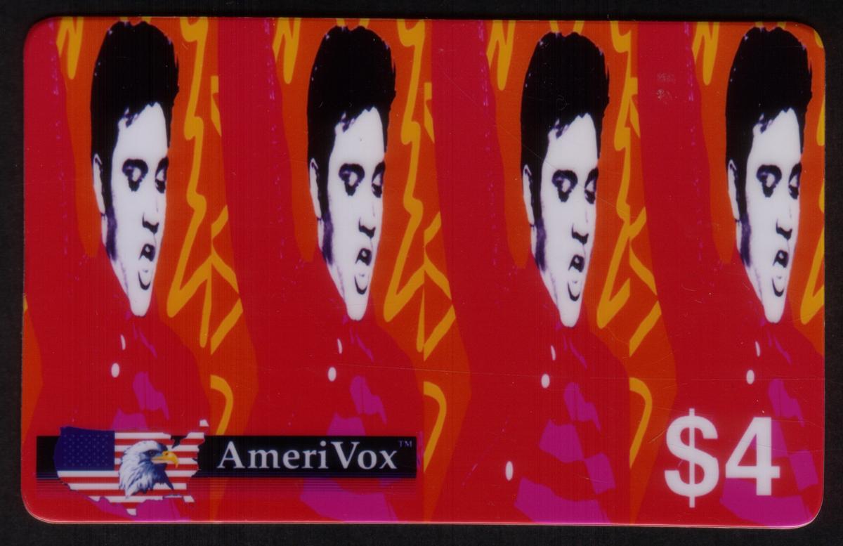Elvis Presley pop art style prepaid card featuring vibrant colors, repeated portraits, patriotic symbols, and a $4 value for calling credit. |