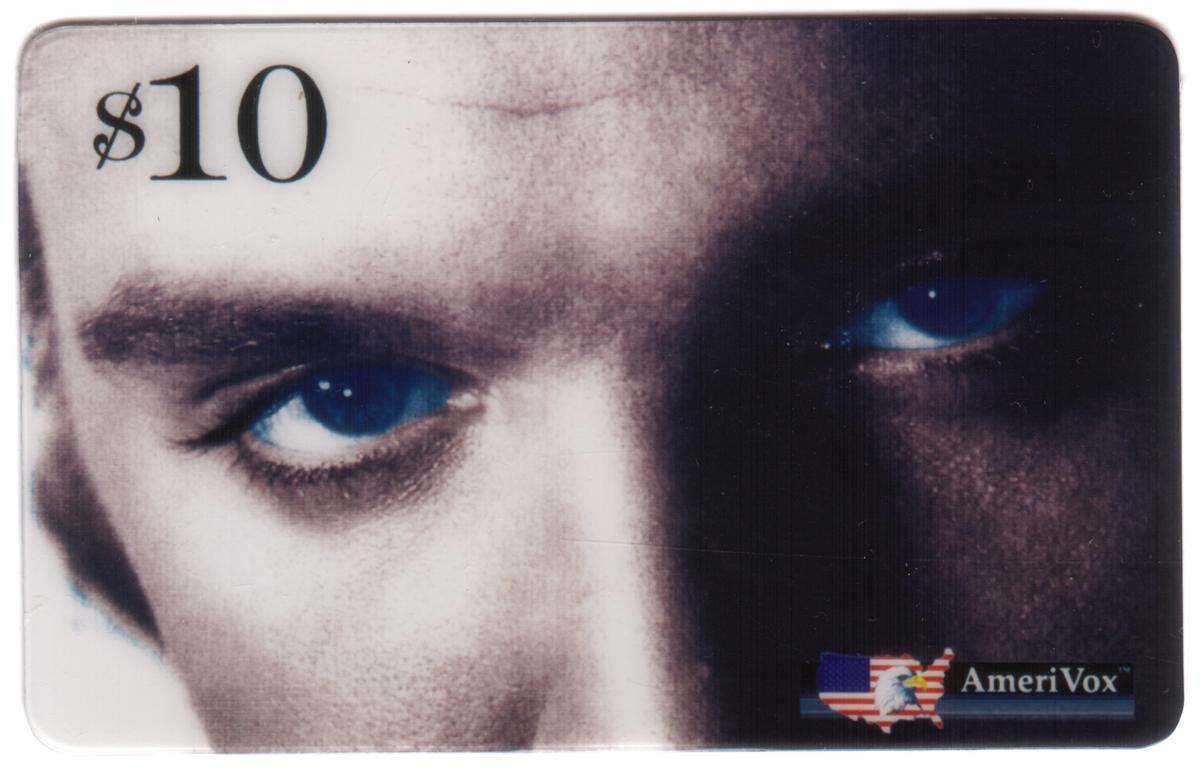 $10 prepaid card featuring a monochrome close-up of a man''s intense gaze with piercing blue eyes, high contrast lighting, and AmeriVox branding.