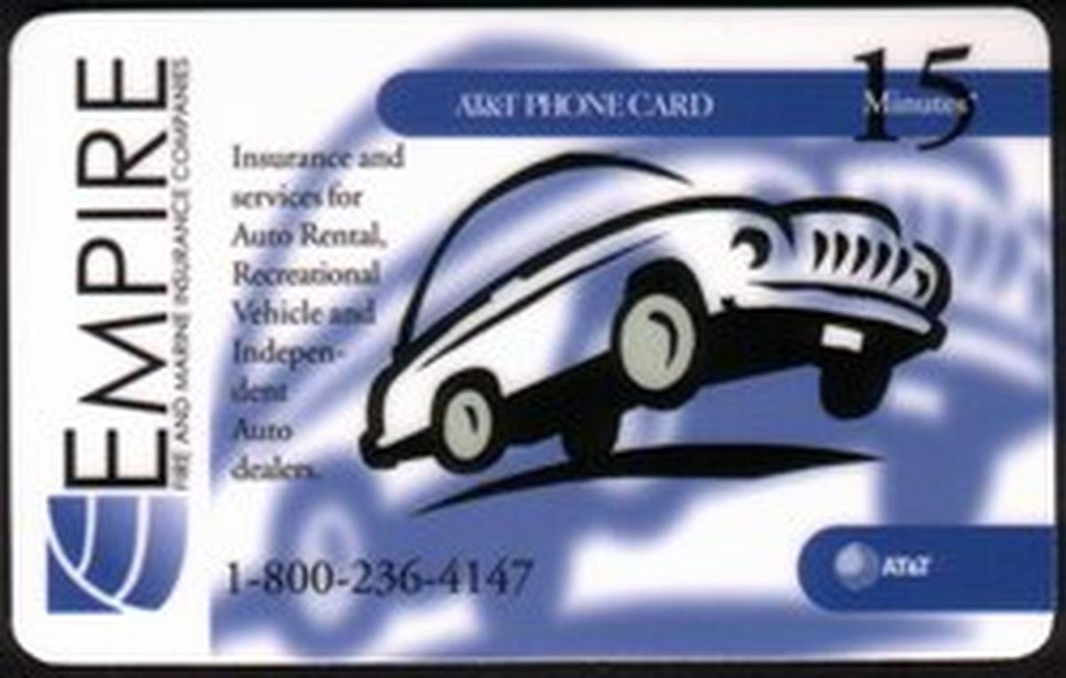 The word "SPECIMEN" is printed clearly in the center, indicating that this card is a sample or promotional piece. The card’s design emphasizes a professional and corporate style, aligning it with promotional use within the automobile insurance and service industry. The combination of Empire Fire & Marine Insurance Companies and AT&T logos ties the card to reputable companies involved in providing insurance and telecommunication services.