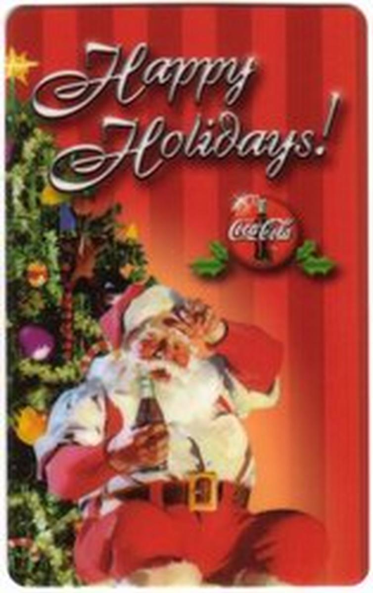 The overall design integrates traditional Christmas elements with the well-known Coca-Cola branding, making this collectible phone card a festive item for holiday collectors and Coca-Cola enthusiasts alike. The card reflects the spirit of the season through vivid colors, iconic figures, and clear branding.