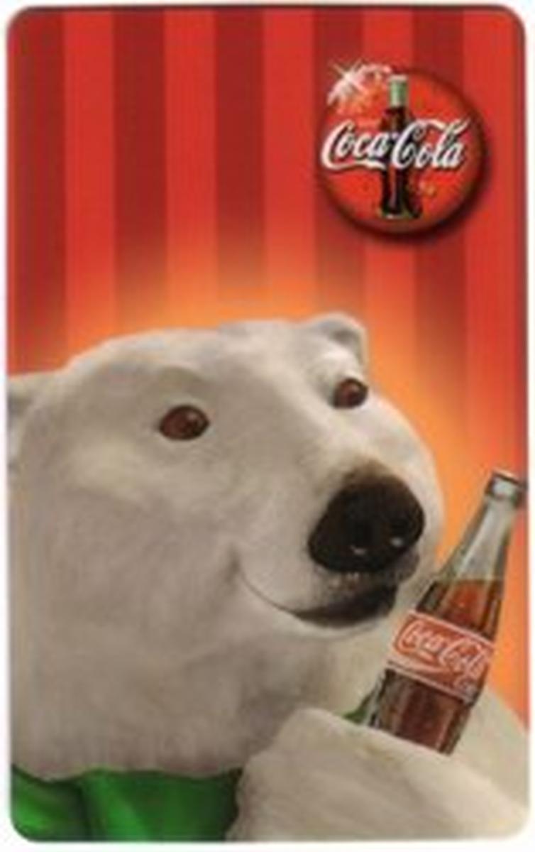 This collectible phone card features a polar bear holding a Coca-Cola bottle. The polar bear is depicted in a realistic style with white fur, partially submerged in icy water. The bear clutches the classic glass Coca-Cola bottle in its left paw, emphasizing the iconic branding. The image captures a wintry, icy environment, reinforcing the polar bear’s natural Arctic habitat.