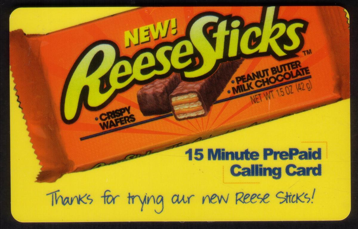 This collectible phone card features a colorful promotional design centered around Reese’s brand products. The card prominently displays the Reese’s logo along with text that reads, “Thanks for trying our new Reese Sticks” and “Reese Sticks Crispy Wafers Peanut Butter & Chocolate.” The design highlights the candy packaging of Reese Sticks, emphasizing the combination of peanut butter and chocolate flavors. The phrase “15m NEW!” appears, indicating a new product announcement or promotional campaign.