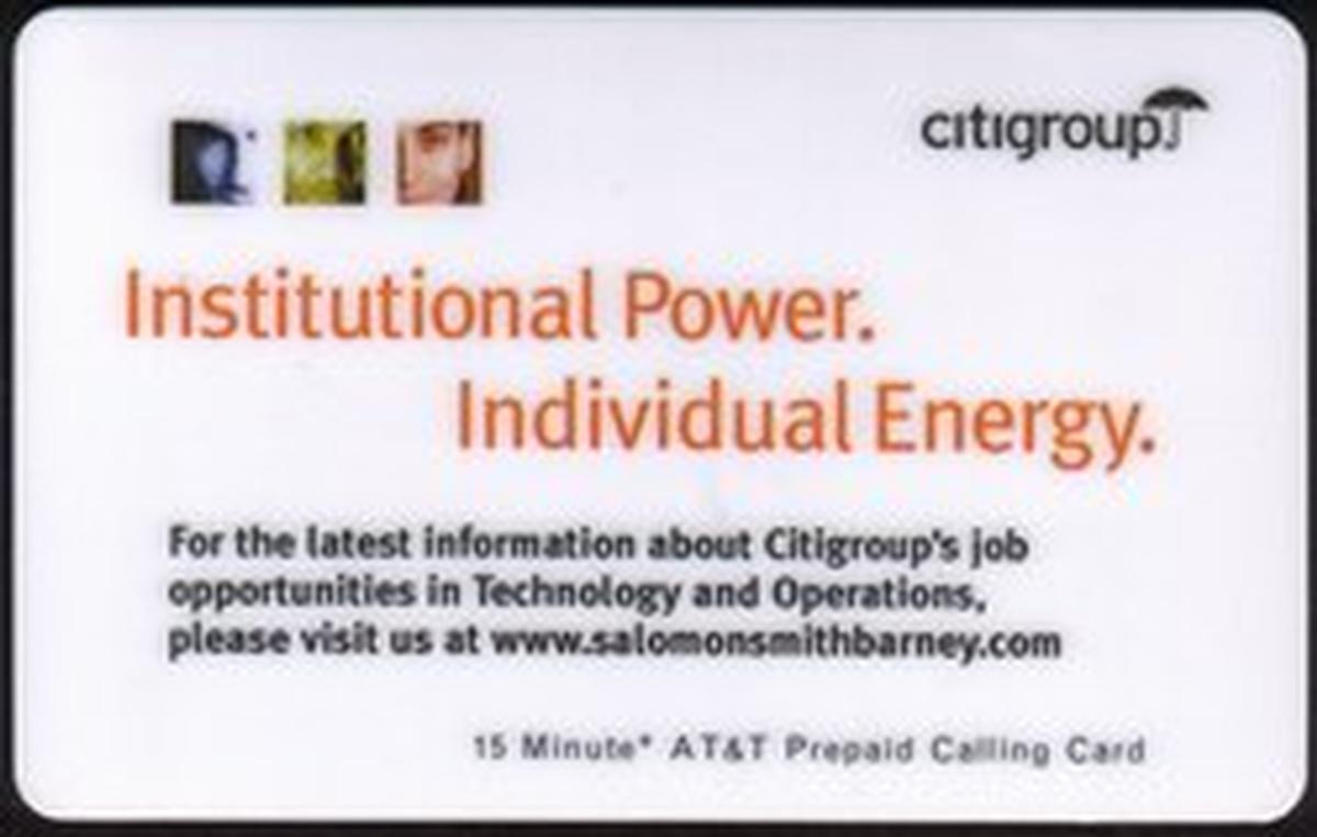 This collectible phone card is a promotional item associated with Citigroup and Salomon Smith Barney. It features no specific imagery beyond the men's faces and corporate logos, maintaining a professional and business-oriented appearance consistent with recruitment and corporate branding efforts.