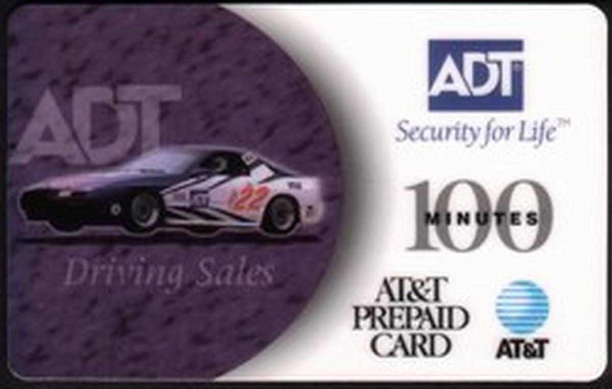 Overall, the card blends automotive imagery with security and communications branding. It captures the essence of speed and safety, combining a racing motif with ADT’s security message and AT&T’s corporate identity. The design highlights the intersection of technology, security, and automotive interests.