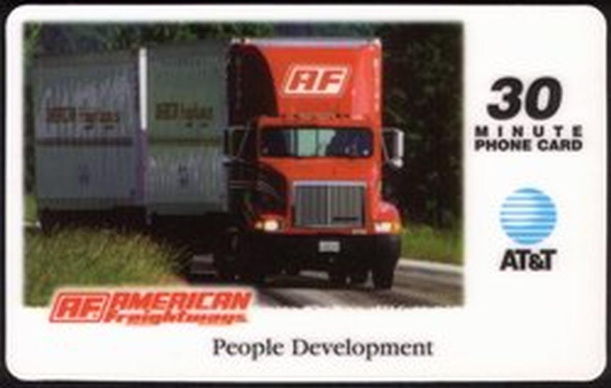 American Freightways trucking scene featuring a red 18 wheeler, logos, and a 30-minute AT&T phone card highlighting logistics, branding, and workforce development.