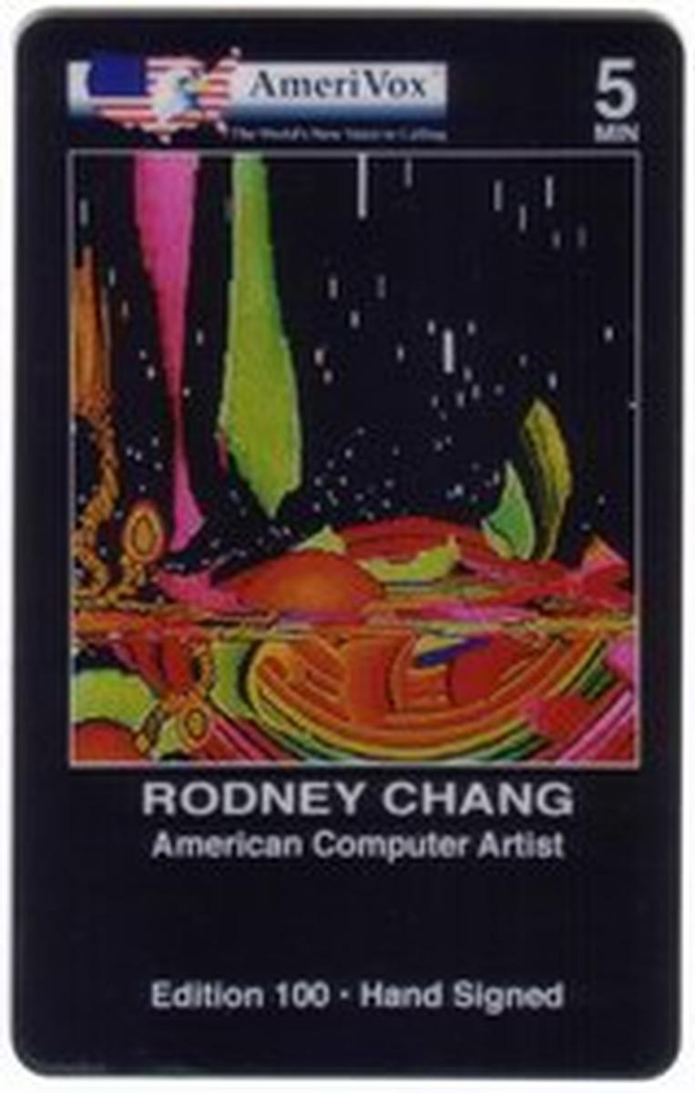 This collectible phone card features artwork by Rodney Chang, an American computer artist. The card is associated with the Hawaii Computer Art Society and Pygoya International Art Group. The design is part of the "Interface" series and prominently displays vibrant, computer-generated imagery. The card includes the text "American Phoneart Hawaii" and "AmeriVox" which relates to the issuing entity.