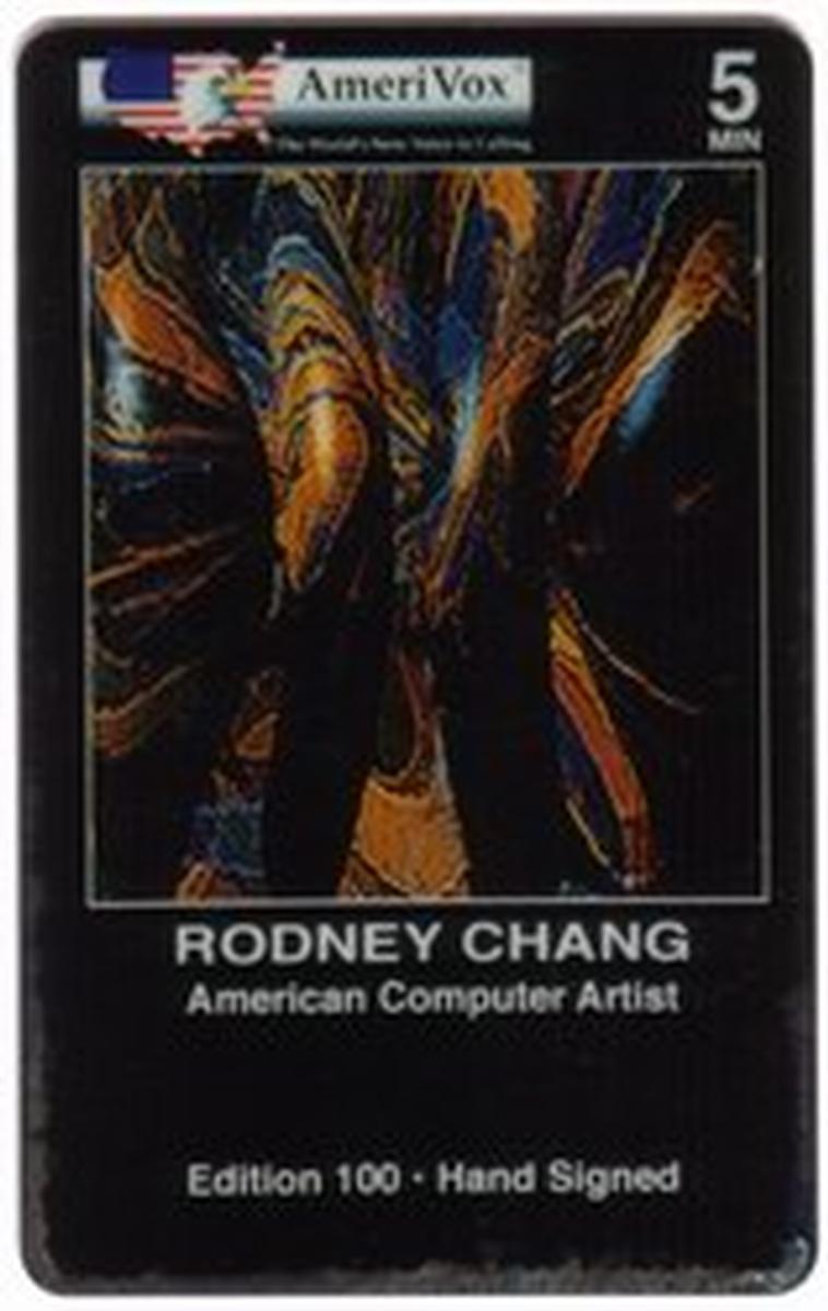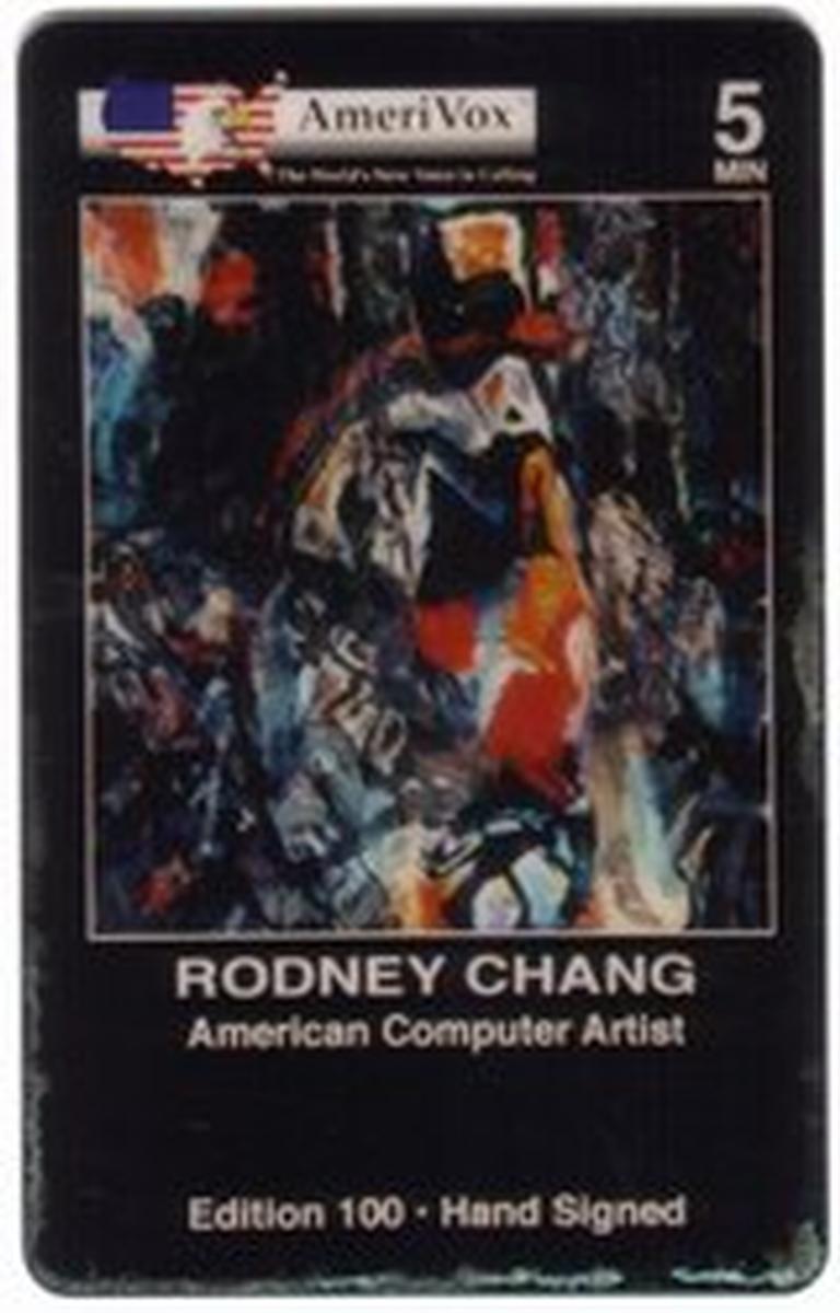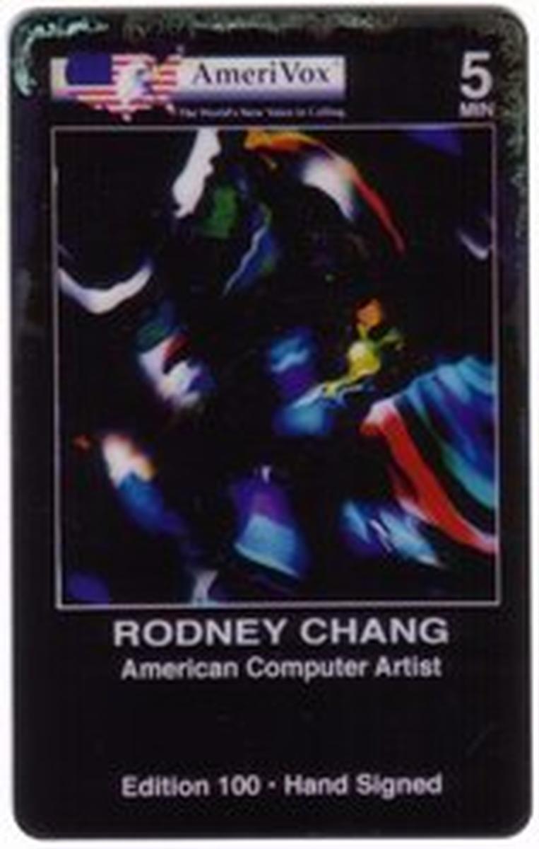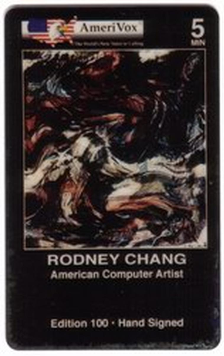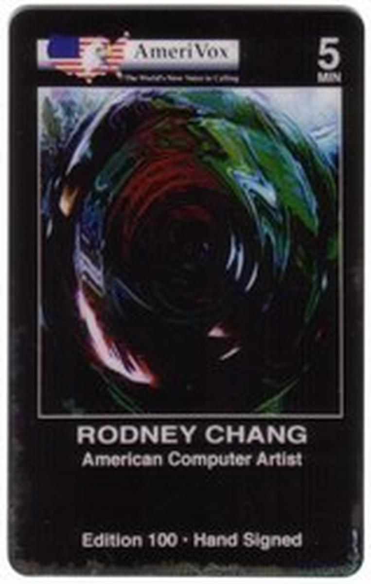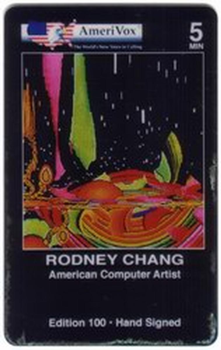 The name "Rodney Chang" appears prominently on the cards, emphasizing the artist’s role and contribution. The cards feature rich, colorful designs that integrate digital art elements with a modern aesthetic. The front of the cards also includes text indicating the artist and the entities involved, such as Pygoya International Art Group and American Phoneart Hawaii, linking these cards to a recognized artistic movement within the phone card collecting community.