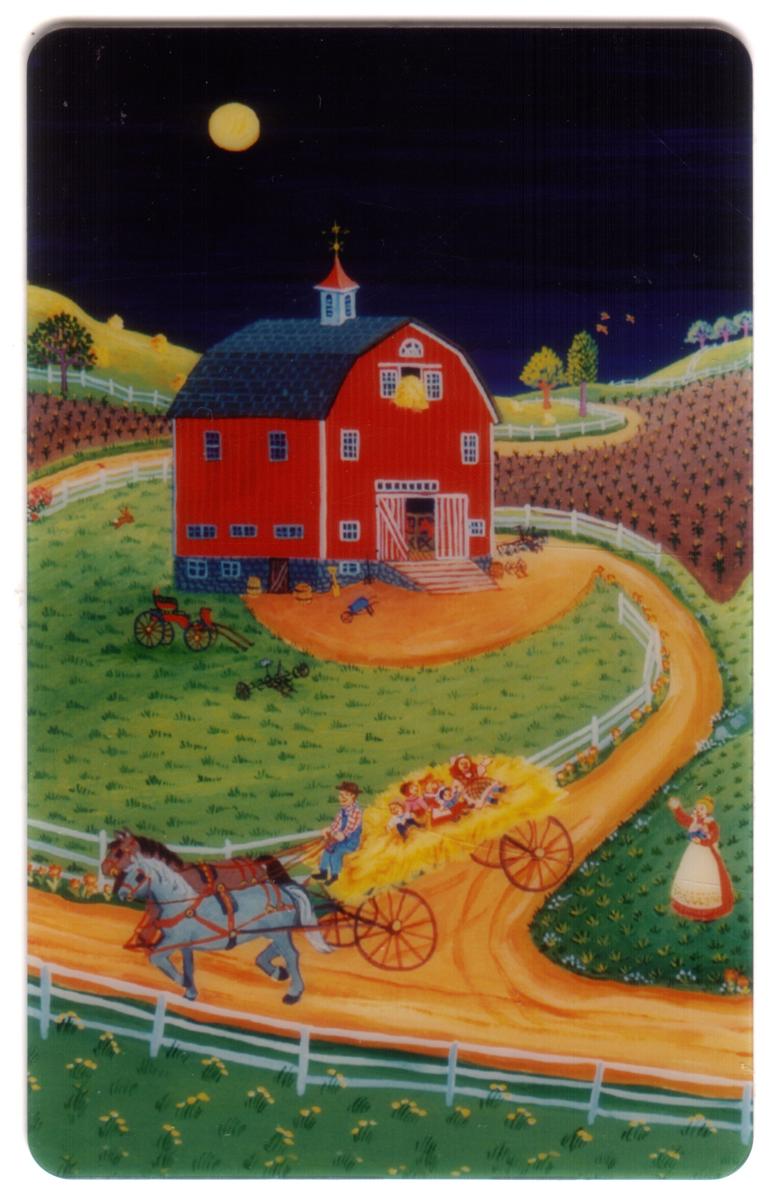 Overall, this collectible phone card combines themes of animals, children, and farmland in a serene, moonlit rural setting. It celebrates the charm and simplicity of a traditional hayride experience during the fall season through detailed and inviting artwork by Marie Fox.