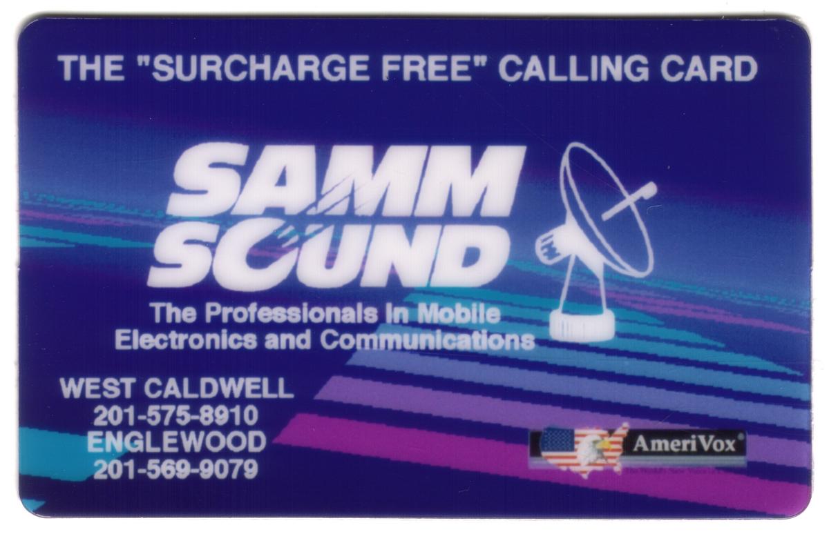 Samm Sound surcharge-free calling card with vibrant blue, purple, teal, and magenta colors, satellite icon, contact info, and AmeriVox logo, highlighting advanced communication technology. |