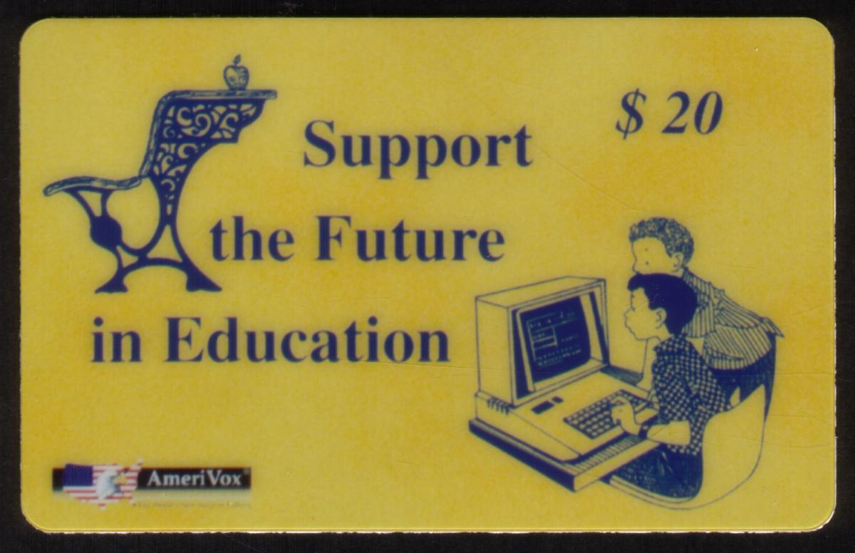 Prominently displayed text reads "Support The Future In Education (Children on Computer)," highlighting the card’s thematic focus on promoting education through technology. The card carries a $20 denomination. The issuer of the card is AmeriVox, whose name appears clearly on the front alongside the proof mark that authenticates the collectible status of the card. The overall design links technology, education, and historic craftsmanship through the Apple IIe computer and the wrought iron chair imagery.