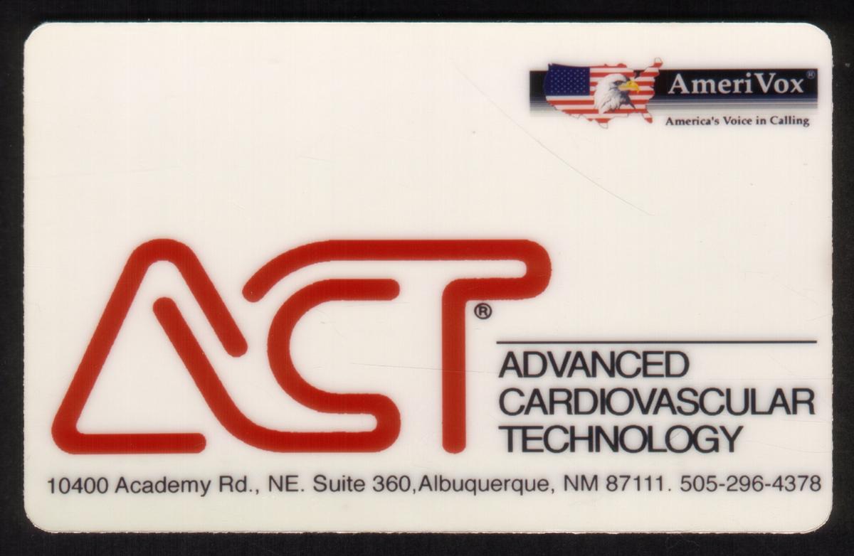 This collectible card features prominent corporate logos and trademarks related to the healthcare and medical industries. The front displays the Advanced Cardiovascular Technology (ACT) brand, based in Albuquerque, New Mexico. The card is marked as a proof, specifically identified with the AmeriVox name, emphasizing its association with promotional and corporate branding within the health sector.