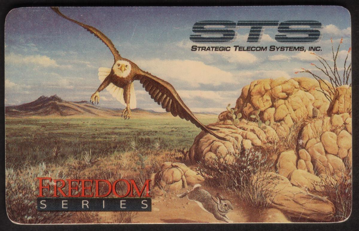 The card belongs to the Freedom Series and prominently displays the series name "FREEDOM SERIES" in bold red and white lettering near the bottom left corner. The top right corner features the logo and name of Strategic Telecom Systems, Inc., abbreviated as "STS." The card’s imagery and text clearly connect it to the Americana theme, emphasizing wildlife and freedom in a natural setting.