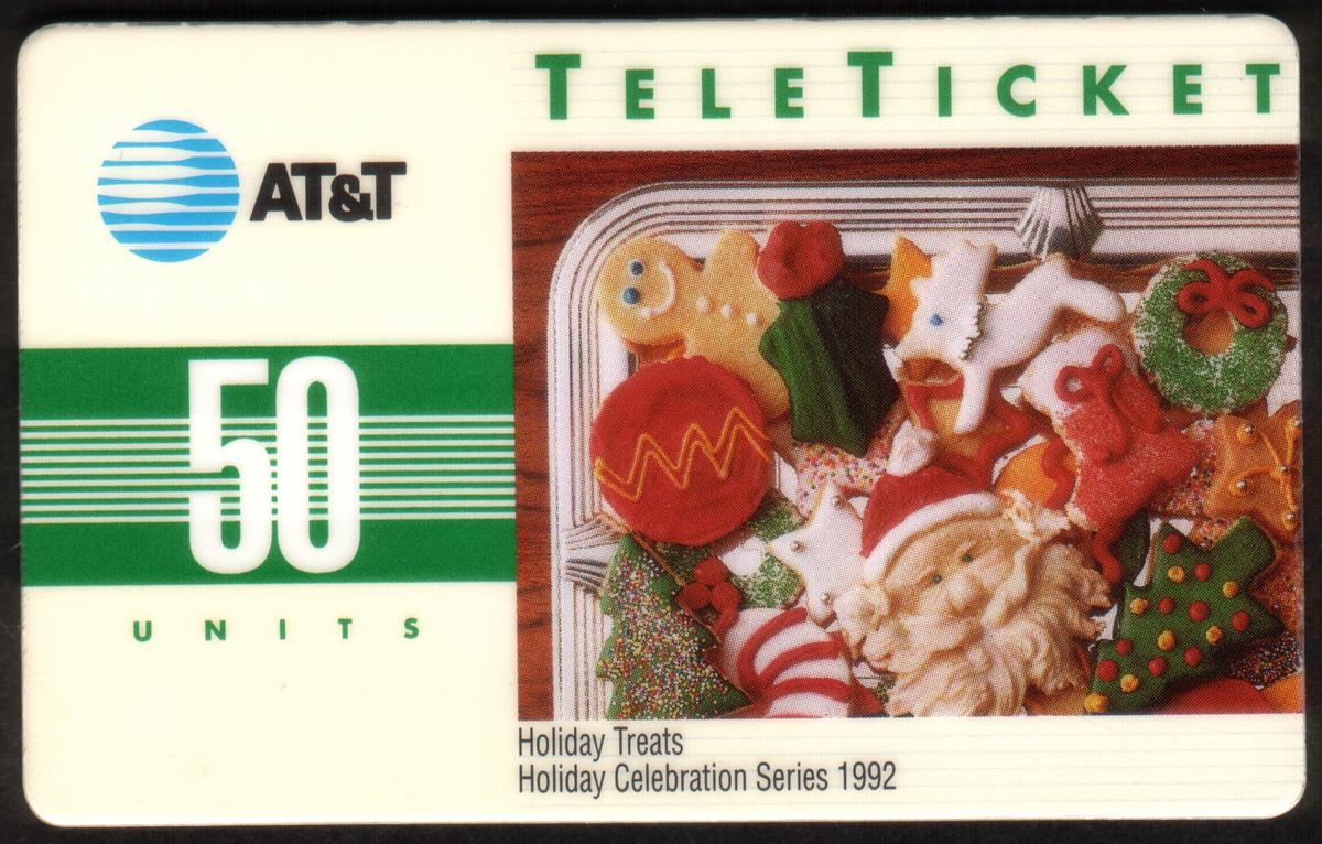 This collectible AT&T Teleticket phone card features a festive design centered on Christmas holiday treats presented in Spanish. The card highlights various traditional Christmas foods and sweets commonly enjoyed during the holiday season. The text on the card includes "Holiday Christmas Treats" in Spanish and specifies "gr3 50u 1992," which references the card's value and year of issue.