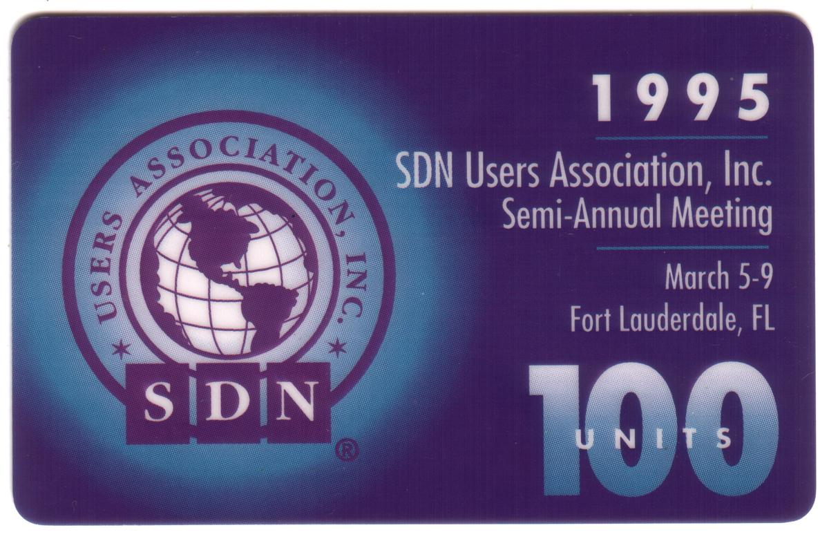 The front of the card contains the text: “1995 SDN Users Association Inc. Semi-Annual Meeting,” clearly denoting the event and its year. Additional wording states “100u SDN Users Association Meeting (03/95) Fort Lauderdale Florida,” identifying the meeting date and location with precise detail. The card’s denomination is marked as “100u,” indicating its use value.