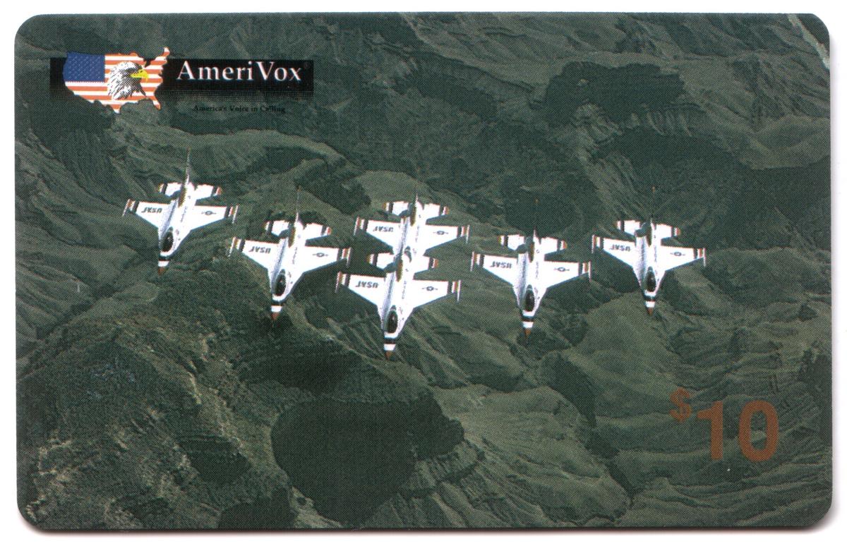 In the upper left corner of the card, there is an AmeriVox logo which includes an American flag and an eagle emblem next to the text "AmeriVox." The denomination "$10" is displayed in the lower right corner of the card in a brownish color. The background consists of rugged green mountains with detailed textures, adding a dramatic natural setting beneath the flying jets.