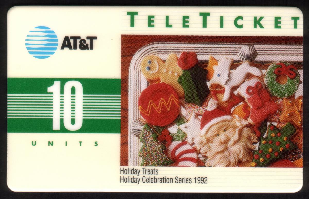 This AT&T Teleticket phone card features the "Holiday Treats" design from the Holiday Celebration Series of 1992. The front of the card displays a colorful, festive assortment of Christmas cookies arranged on a rectangular white plate with red and white stripes along the edge. The cookies are shaped and decorated as various holiday-themed figures, including a Santa Claus face, a red stocking, a Christmas tree, a wreath with a red bow, a candy cane, a gingerbread man, a reindeer, and a star, all adorned with vibrant icing and sprinkles.