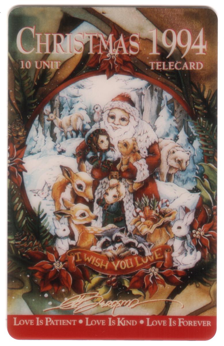 Christmas 1994 Santa scene featuring Santa Claus, woodland animals, girl, snow, and festive wreath, with love message and signature; holiday-themed collectible. |