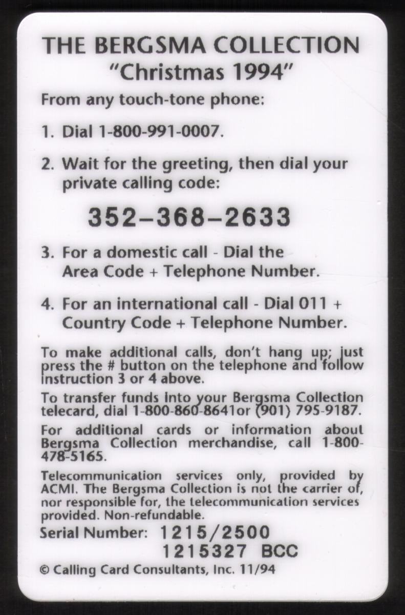 The card includes the signature of the artist, Bergsma, prominently displayed near the bottom center. It represents a combination of artistic charm and holiday spirit, making it suitable for collectors interested in Christmas-themed phone cards or festive artwork with an emphasis on love and kindness.