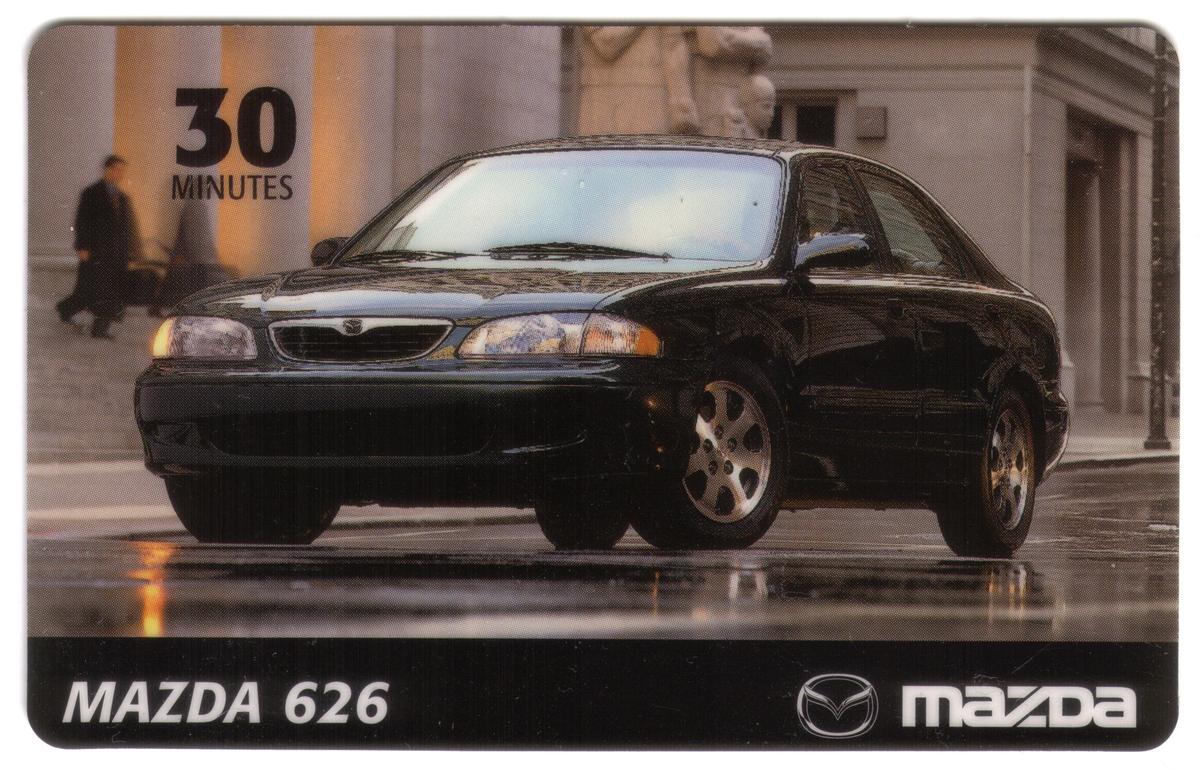 This collectible phone card features a 30-minute calling time and is branded with the Mazda 626 automobile prominently displayed. The card’s design includes a clear depiction of the Mazda logo, positioned to emphasize the automotive theme focused on cars and automobiles. The imagery showcases the Mazda 626 model, highlighting its profile with attention to brand recognition, associated with the promotional aspect referenced.