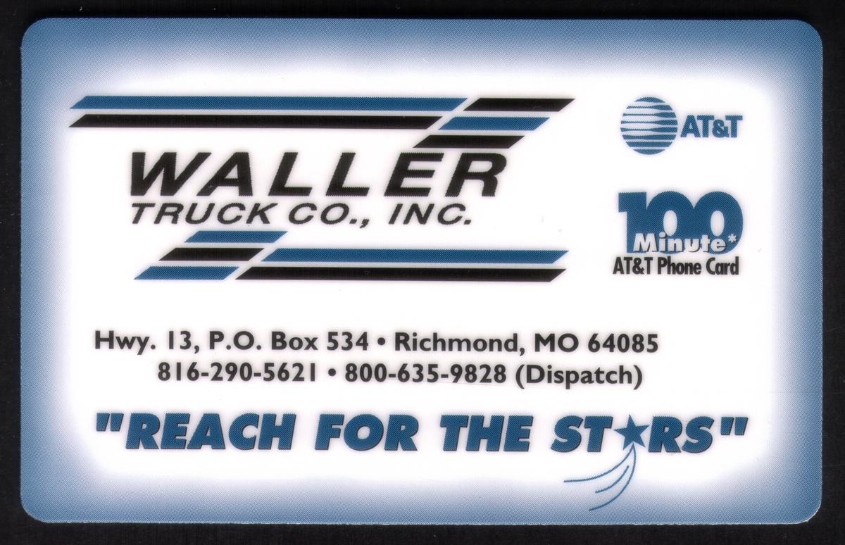 This collectible phone card features a promotional design for Waller Truck Co., Inc., located in Richmond, Missouri. The card displays a detailed illustration of a semi-truck on a smooth, road-like background. The truck is depicted with a prominent cab and trailer in shades of blue and white, showcasing a clean and professional image associated with the trucking business. Above the truck illustration, the phrase "Reach for the Stars" is printed in a clear, bold font, emphasizing an aspirational message.