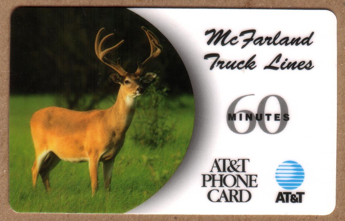 Overall, the card’s design balances corporate branding with a focus on McFarland Truck Lines’ promotional message. The eight-point deer emblem and clear depiction of the truck establish its identity in the trucking and transport sector, while the AT&T logo and “SPECIMEN” marking situate it within collectible phone cards issued by the company.