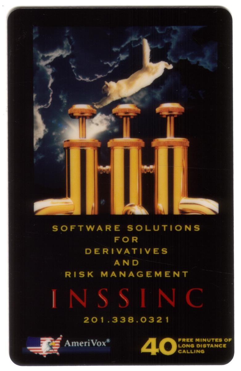 The combination of computer technology themes is reflected through this artistic layout featuring a cat and musical instrument components, all tying into INSSINC's focus on software solutions and risk management. The card’s presentation suggests it was produced for AmeriVox, a provider of collectible phone cards.