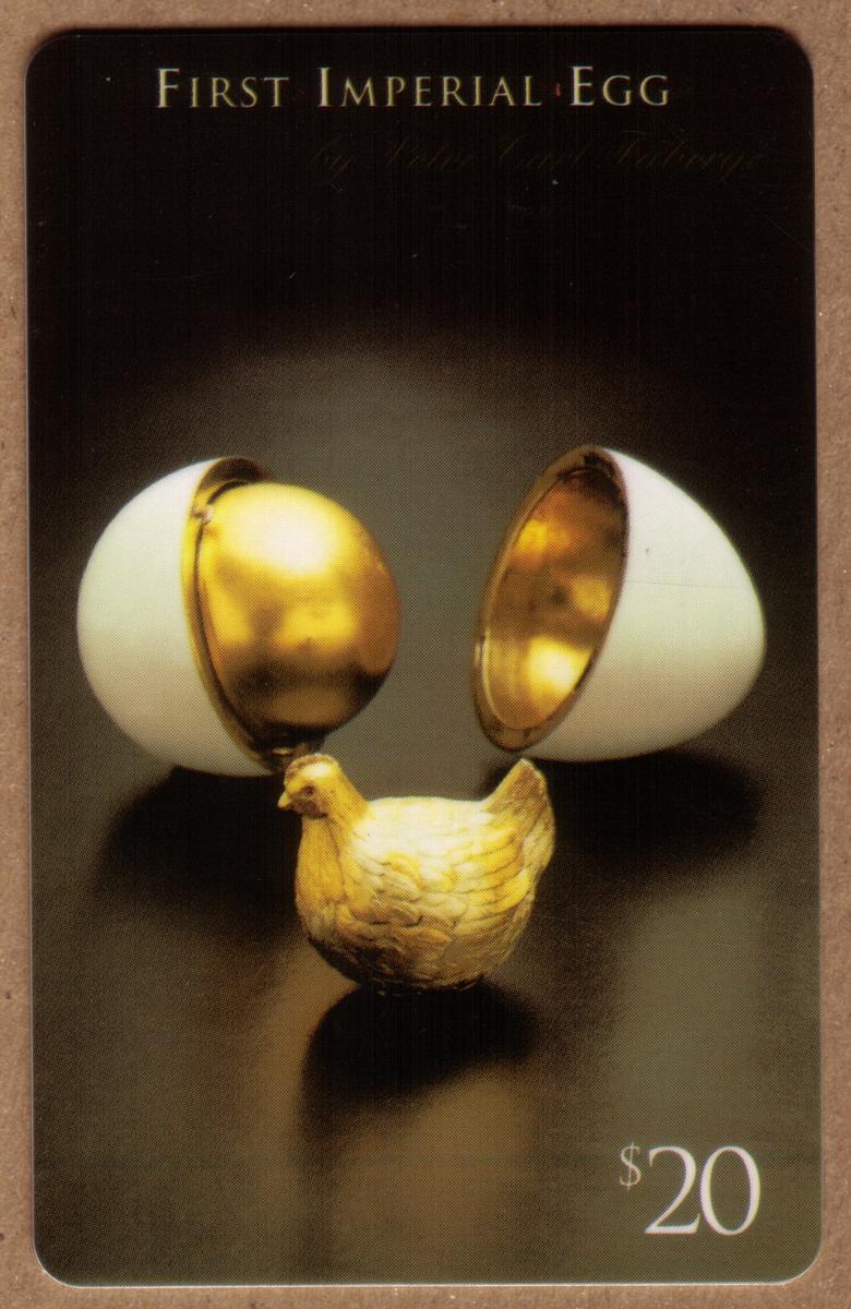 This collectible card features a detailed image of the Forbes Imperial Fabergé Egg, known as the First Imperial Egg created by jeweler Peter Carl Fabergé. The artwork prominently showcases the egg’s intricate design, which includes rich gold accents, colorful enamel work, and sparkling rubies. It commemorates the craftsmanship of Fabergé, a renowned jeweler to Czar Alexander III, who commissioned the famous Easter eggs as exquisite artworks.