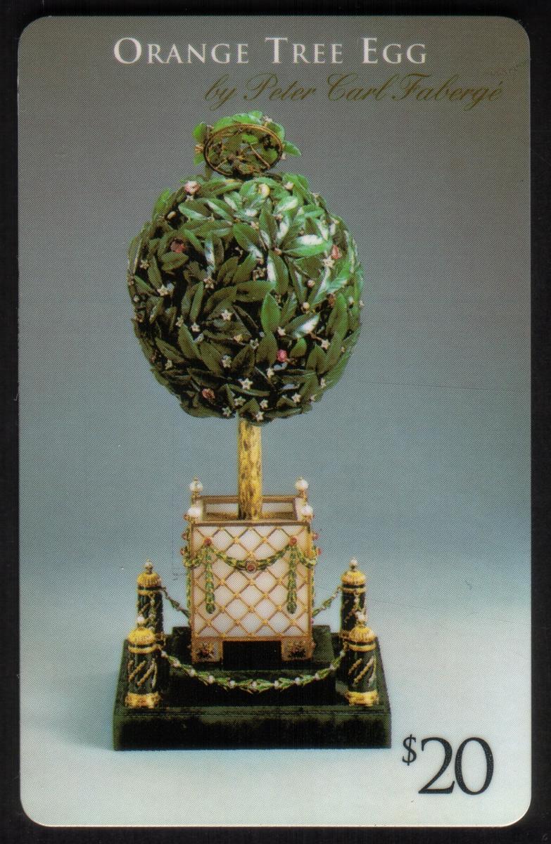 Fabergé Orange Tree Egg phone card featuring intricate enamel, gold, nephrite, and jewels, inspired by the imperial masterpiece created for Czar Nicholas II. |