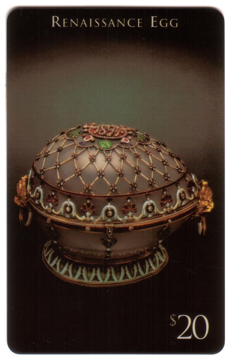 The card includes clear printed text referencing the Renaissance Egg and the Forbes Imperial Egg Collection, as well as the name Peter Carl Fabergé. The combination of precious materials and the historical context presented makes this card a valuable item for enthusiasts of Fabergé art and Russian Imperial artifacts.