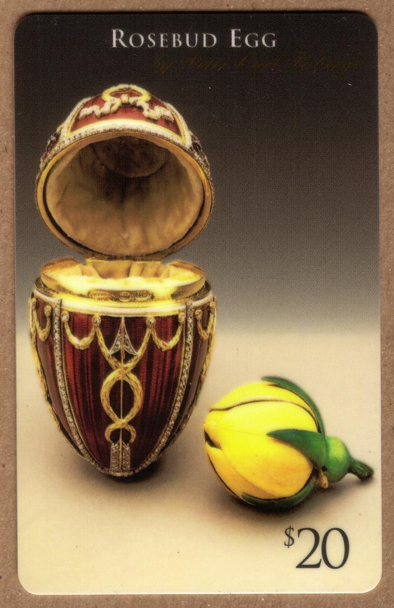 Printed text on the card clearly identifies Peter Carl Fabergé, the Forbes Imperial Egg Collection, and the Rosebud Egg. The card also mentions the $20 denomination, indicating its value as a collectible. The straightforward and factual presentation makes it a valuable piece for collectors interested in historical artwork, imperial Russian treasures, and Fabergé’s legacy.