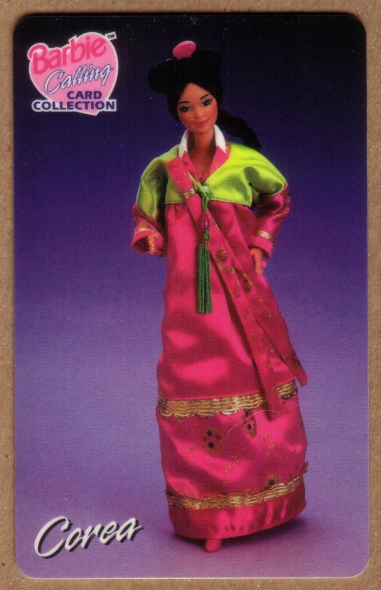 This collectible phone card features an image of a Barbie doll dressed in traditional Korean native attire. The doll wears a vibrant hanbok, comprising a bright pink dress with golden embroidery along the hem and midsection, paired with a lime green jeogori (jacket) with pink cuffs. The outfit includes a decorative sash draped over one shoulder, and a green tassel hanging down the front, adding intricate detail to the costume. The Barbie’s long black hair is styled neatly with a pink hair accessory on top.