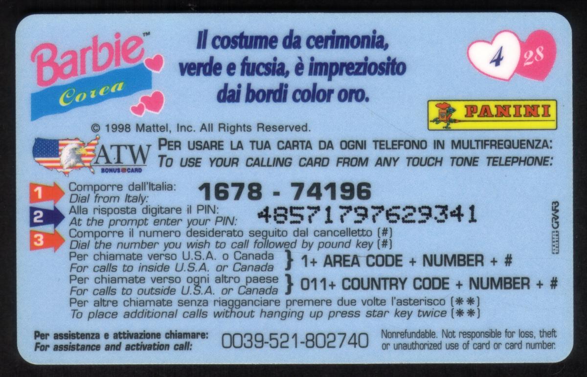 Manufactured by Mattel in 1998, this collectible phone card was made in Korea and is labeled for use in Italy. It is part of a series featuring Barbie dolls in native dress from different countries. The card is associated with AmeriVox and ATW, brands connected to phone card services.