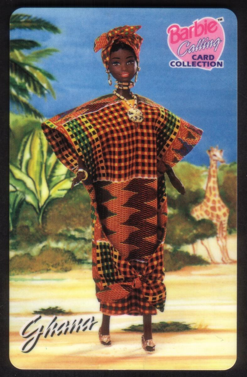 This collectible phone card features a Barbie doll dressed in a Ghana Native Dress. The Barbie doll is styled with a traditional African outfit, including a colorful, patterned garment with orange, black, yellow, and green checkered and striped designs. The doll also wears a matching head wrap and jewelry with gold tones, including earrings and a necklace.