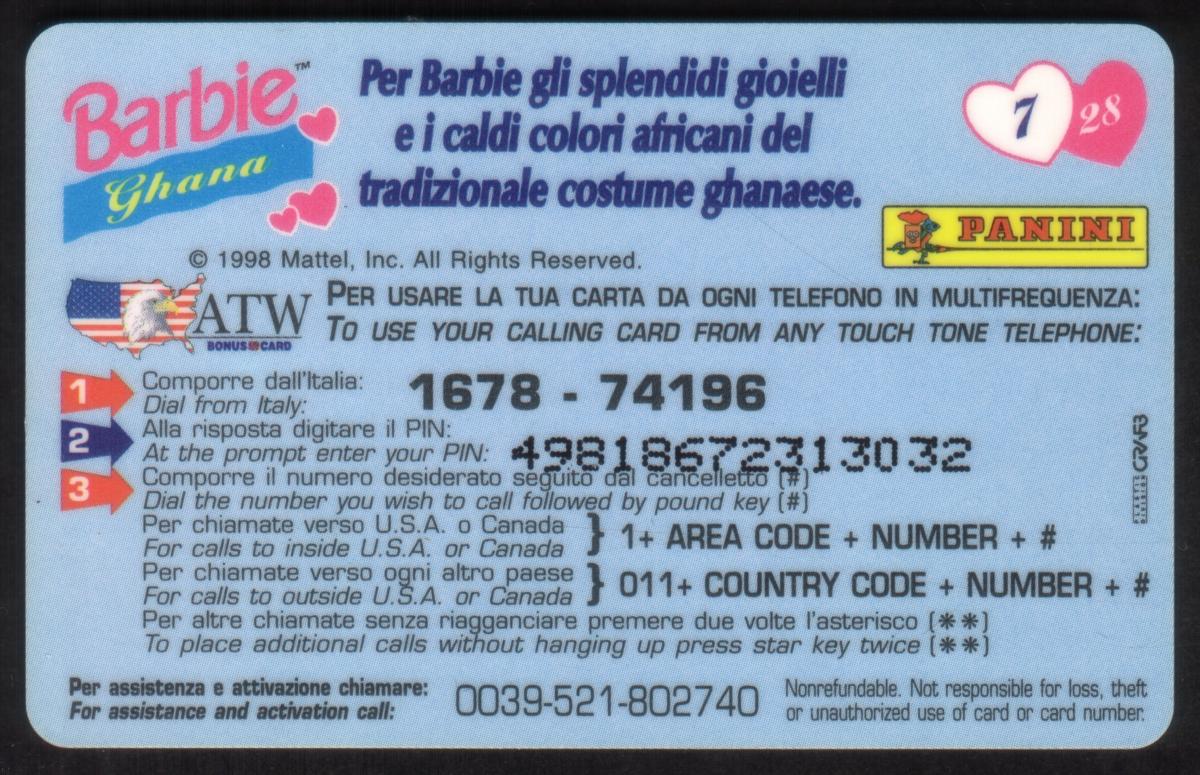 This phone card is part of the 1998 Mattel collection and is designated for use in Italy. It represents number 7 of 28 in the series and is issued by AmeriVox under the ATW brand. The overall design celebrates Ghana's native culture through the iconic Barbie figure.