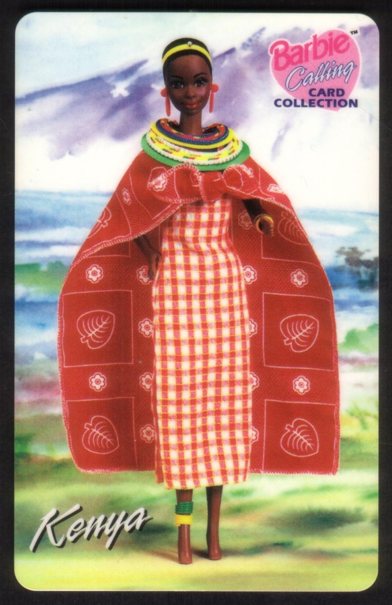 This collectible phone card features the Barbie doll from the Barbie Calling Card Collection wearing the Kenya Native Dress. The Barbie doll is dressed in a red and white checkered dress with a draped red shawl adorned with white leaf and floral patterns. She wears traditional Kenyan jewelry around her neck composed of several colorful beaded necklaces, and matching beaded bracelets on her legs. The doll has a dark complexion and wears a yellow and green headband.