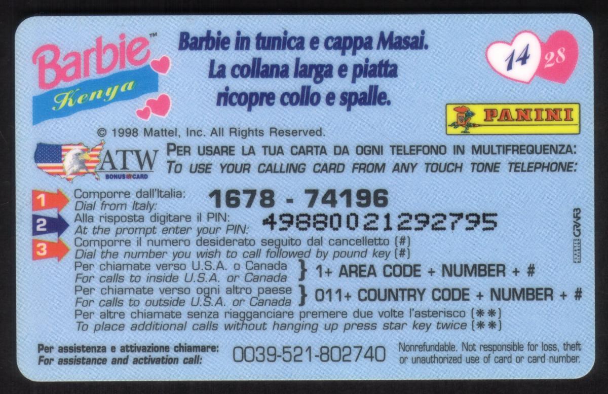 The card is issued by AmeriVox and is marked as #14/28 Used. It was produced by Mattel Inc. in 1998 and is designated for use in Italy. The card carries no other logos or text beside those described.