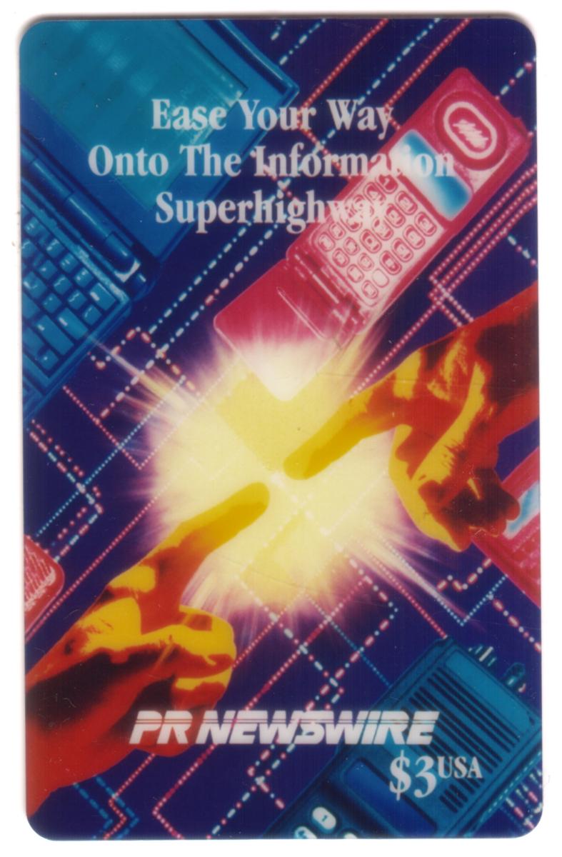 At the top of the card, the text reads "Ease Your Way Onto The Information Superhighway," emphasizing a theme related to digital communication and access to online information. The lower portion of the card features the "PR NewsWire" logo in bold white text, indicating the commercial news distribution service. Adjacent to this logo is the denomination "$3 USA," showing the card’s value and country of issue.