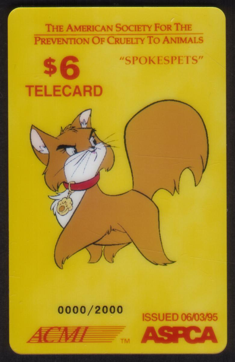 This collectible telecard features an animated cat character from the American Society for the Prevention of Cruelty to Animals (ASPCA) "Spokespets" series. The card has a bright yellow background with the ASPCA name and logo prominently displayed in red at the bottom right corner along with the issue date of June 3, 1995. The card’s value of $6 is printed near the top left in bold red text, alongside the word "TELECARD" and the title "SPOKEPSPETS."