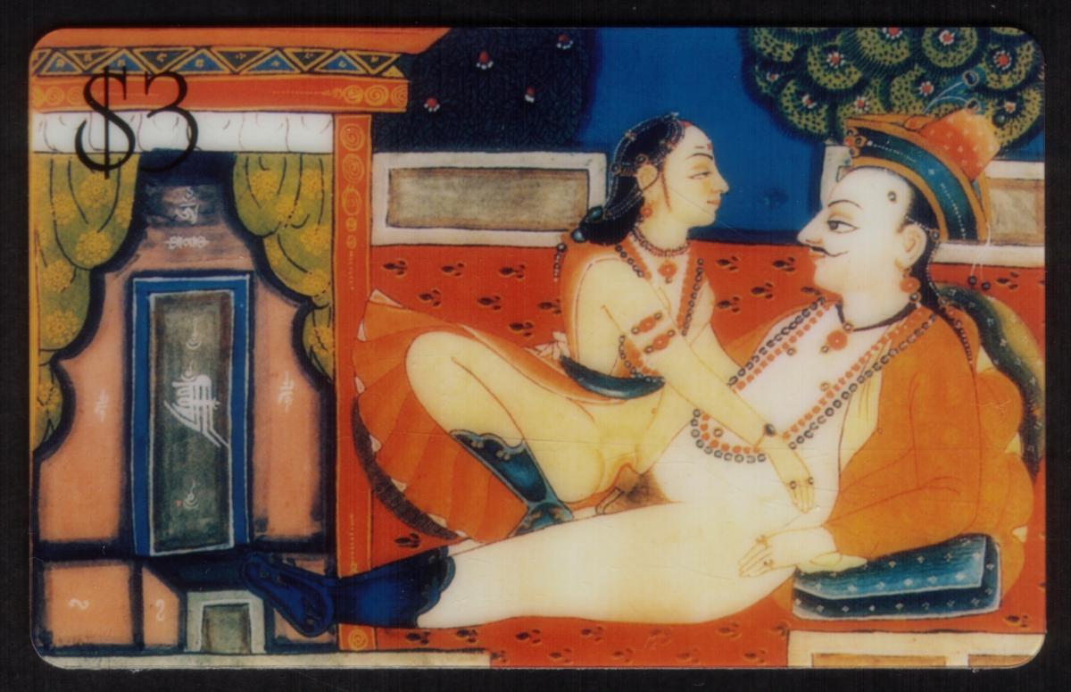 The card bears a printed value of "$3" in the upper-left corner. The artwork is consistent with traditional Indian miniature painting styles associated with classic Kama Sutra illustrations. The imagery confirms the card’s focus on adult themes surrounding eroticism and sensuality.